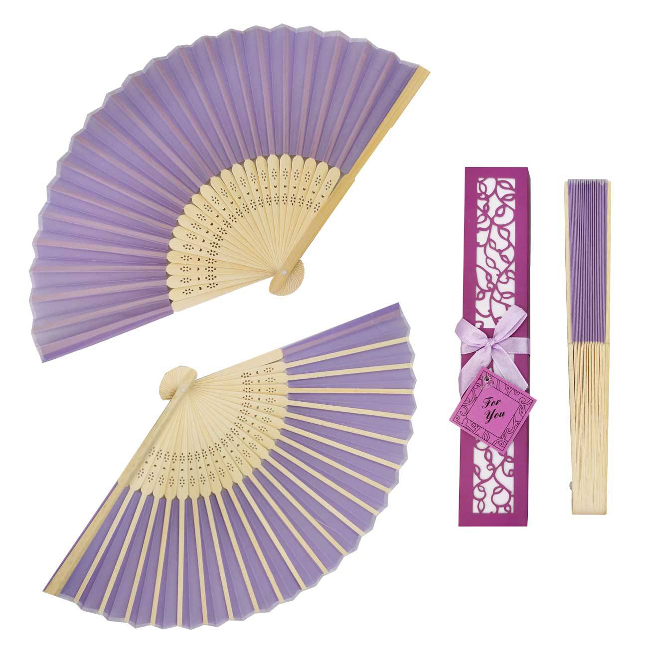 Estos abanicos de seda y bambú delicadamente tallados miden aproximadamente 21 cm de largo cuando están cerrados. La caja troquelada de regalo a juego es una presentación única y dará un toque de elegancia a tú boda, celebración o evento.