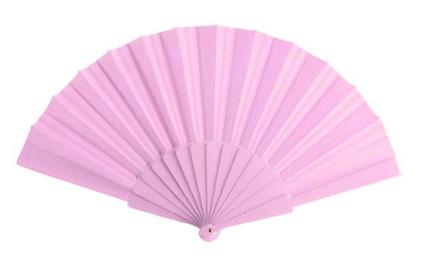 Abanico de varillas de plástico y tela de poliéster en color.
