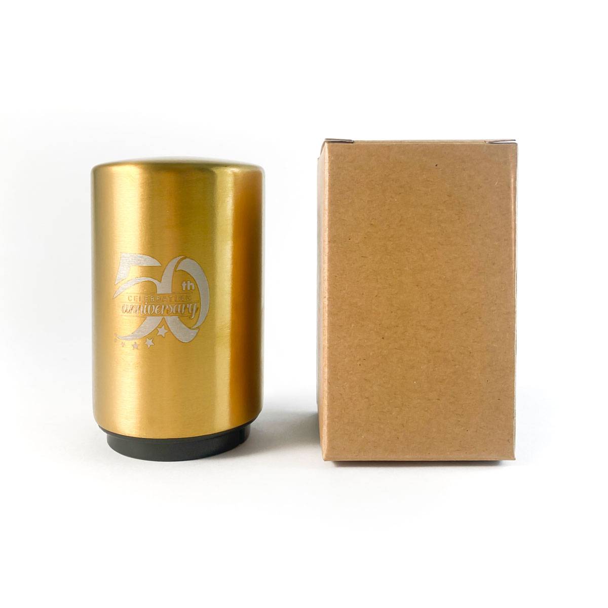 Elegante abridor metálico en color dorado con diseño de 50 aniversario. Perfecto para los aniversarios de oro.