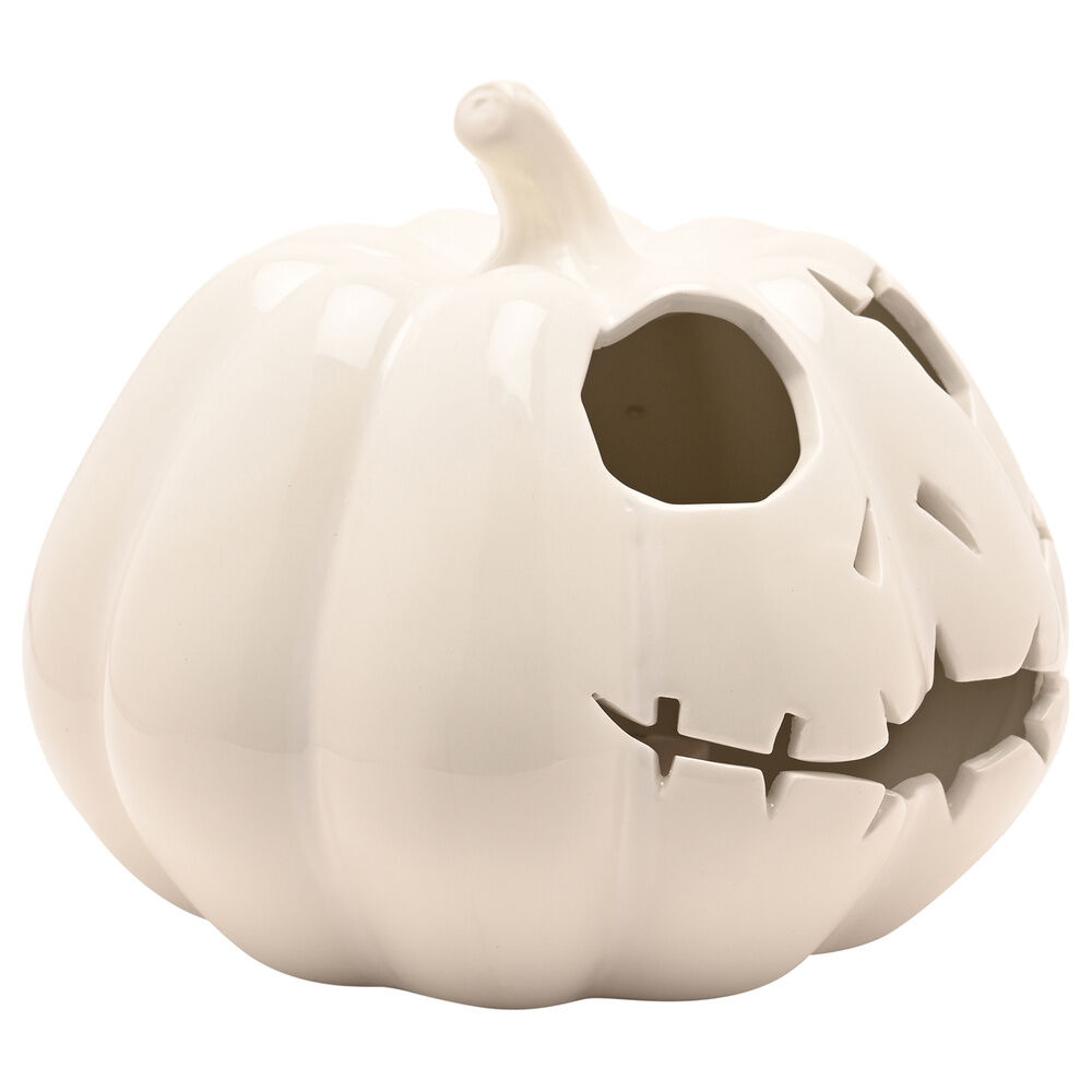 Fabricada en cerámica con una silueta distintiva en forma de calabaza, presenta el rostro tallado de Jack, fácilmente reconocible, con ojos brillantes que crean un efecto atmosférico.