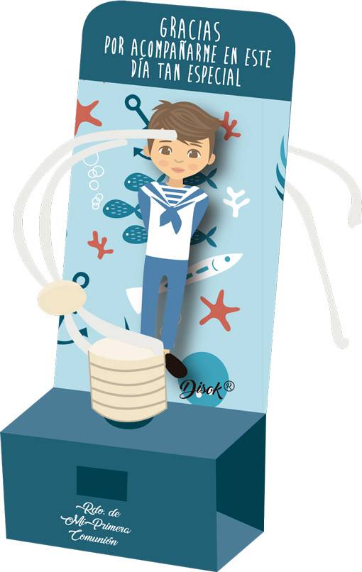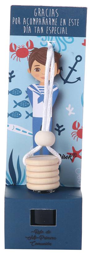 Original y práctico ambientador para colgar en el coche con diseño de muñequito marinero de comunión, sobre fondo marino.