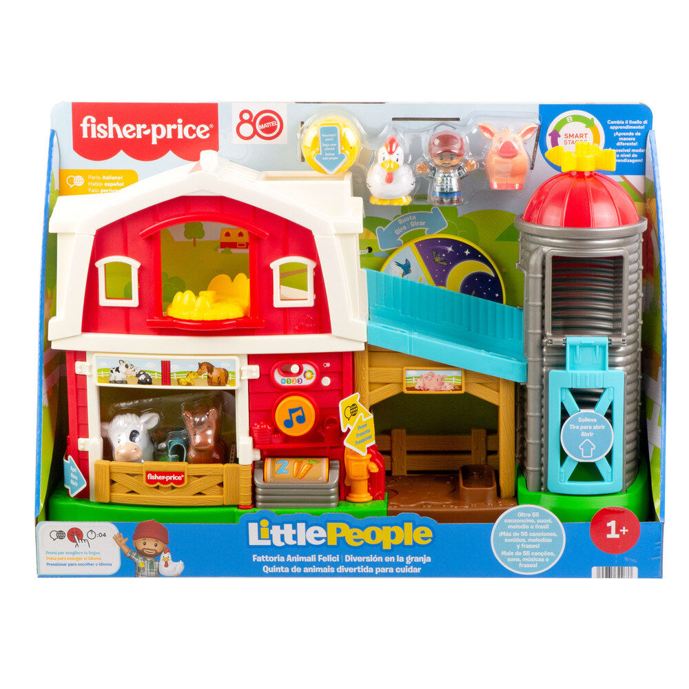 Contiene: 1 conjunto de juego, 5 figuras y 1 accesorio. Planta la semilla de la imaginación en los juegos de los más pequeños para que cuenten un sinfín de historias creativas con el conjunto de juego Diversión en la granja de Fisher-Price. Este conjunto de juego interactivo cuenta con un granero de dos pisos repleto de actividades prácticas por todas partes, además de un silo con un conducto para dejar caer cosas y varios compartimentos para alojar y cuidar a los animales. Mientras los niños representan divertidos días en la granja, la tecnología Smart Stages les enseña los antónimos, los colores, los números y mucho más gracias a más de 50 canciones, sonidos y frases. Incluye 1 figura de granjero, 4 animales y 1 accesorio de paca de heno. Utiliza el botón del mundo para seleccionar un idioma: castellano, inglés, italiano o portugués. Incluye 2 pilas AA. Los colores y la decoración pueden variar. Ninguna advertencia aplicable