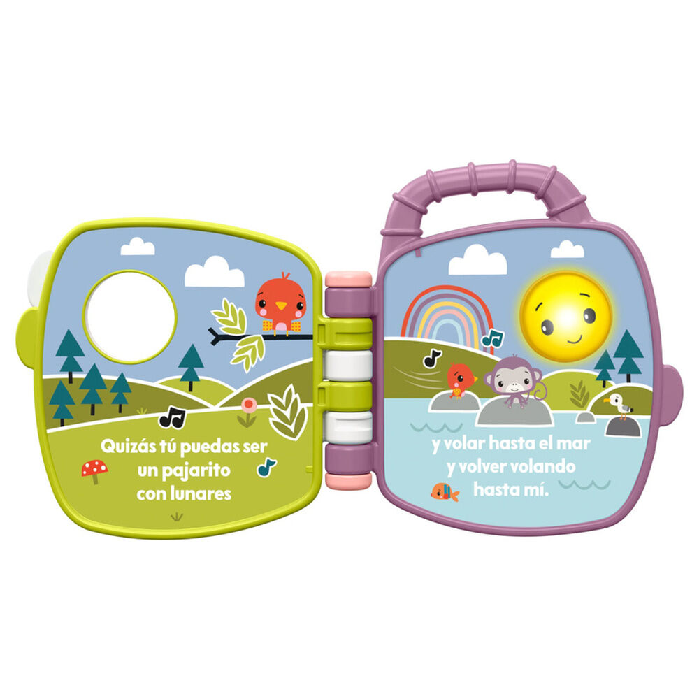 El bebé puede acurrucarse con un amigo conocido con este libro de juguete musical que reproduce la popular canción del Monito morado del exitoso Gimnasio-piano pataditas superaprendizaje de Fisher-Price*. El Libro de cuentos musical del Monito morado cuenta con 2páginas fáciles de pasar, adorables ilustraciones inspiradas en la canción y la letra de la canción impresa para fomentar la alfabetización temprana. Solo tienes que pulsar el botón del sol o pasar las páginas para activar las luces, la música y los sonidos. El asa de fácil agarre tiene un tamaño justo para que los más pequeños lleven su “lectura” favorita dondequiera que vayan. Los colores y la decoración pueden variar. Ninguna advertencia aplicable.