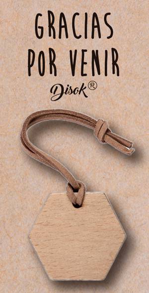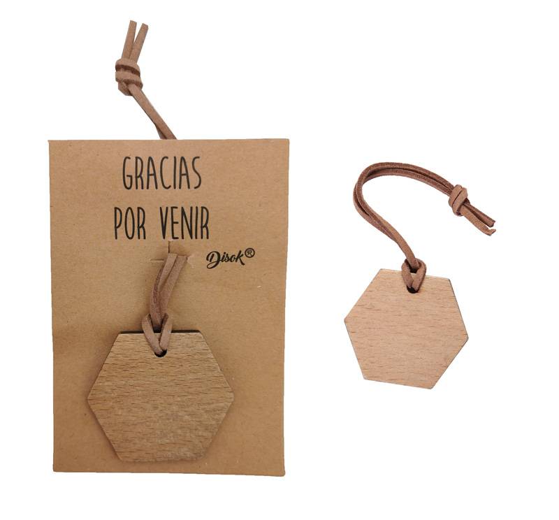 Llavero de madera en forma hexagonal con delicado cordel para colgar.