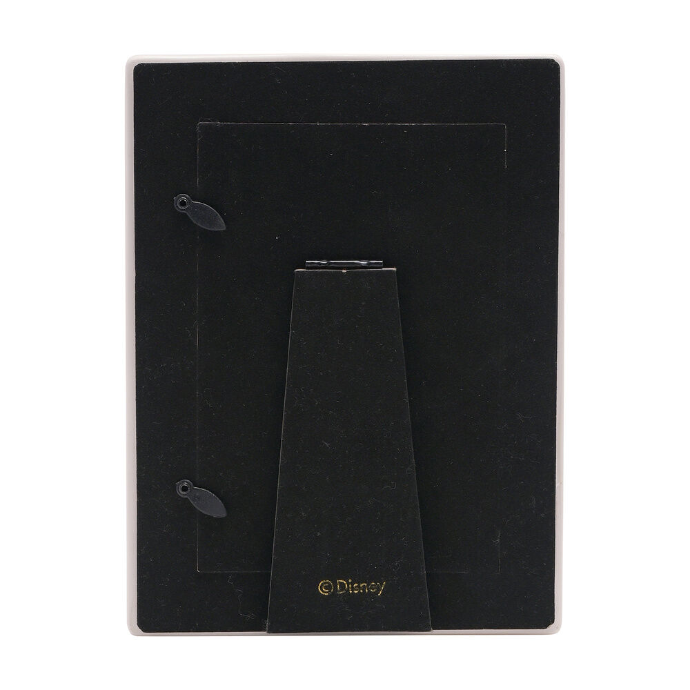 El marco de fotos de cerámica blanca presenta un acabado moteado, con detalles en el borde dorado e imágenes impresas de Mickey y Minnie Mouse. Está diseñado para exhibir retratos utilizando el soporte incluido.