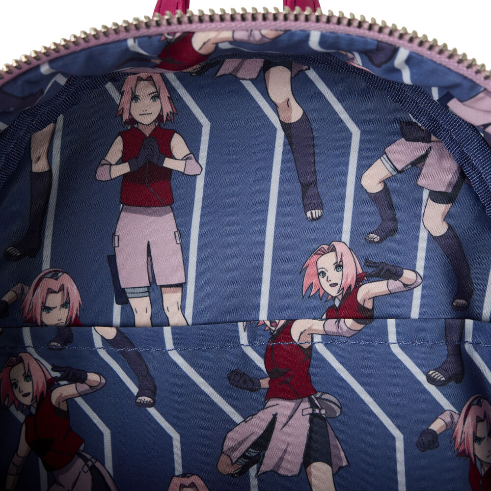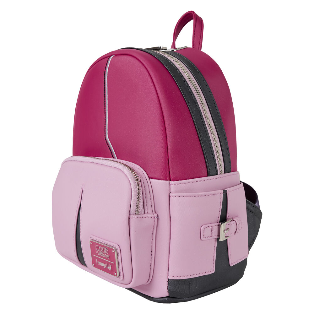 Tamaño: 22,86×11,43×26,67cm. Piel vegana (poliuretano) con ribete de poliéster. Tirantes ajustables. Bolsillo frontal con cremallera. Bolsillos laterales. Herrajes plateados brillantes. Apliques, repujados, metal moldeado y detalles impreso. Forro interior a juego.