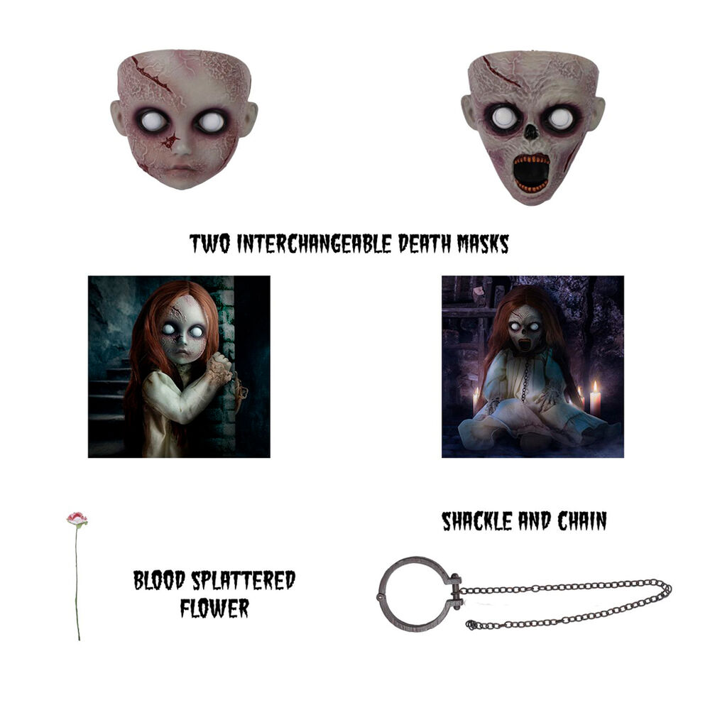 Tamaño: 25,5cm. Se muestra con su característico vestido desgastado y unos ojos de cristal que te persiguen con la mirada. Cuenta con 18 puntos de articulación e incluye 1 túnica con alambre interno en la capucha, 2 placas faciales intercambiables, 5 manos, 1 rosa con salpicaduras de sangre y 1 grillete con cadena.