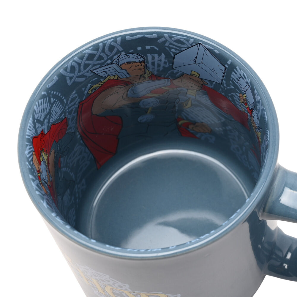 Cerámica. Capacidad: 500ml. Con decoración en el interior. Cuenta con un llamativo adhesivo interior que se revela a medida que se vacía la taza, lo que le da un toque divertido y único. Esta llamativa pieza combina la funcionalidad práctica con un atrevido estilo de superhéroe, lo que la convierte en un regalo ideal.