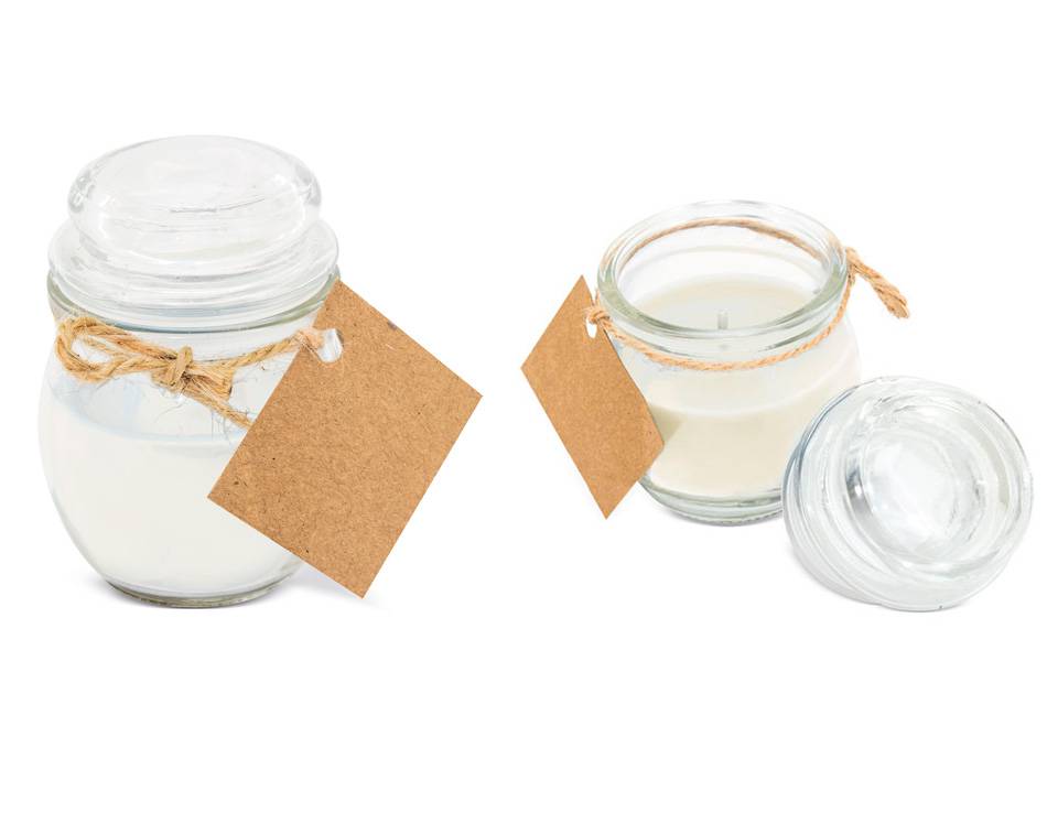 Vela aromática con aroma a coco. Presentada en tarro de cristal con tarjeta kraft sin personalizar.