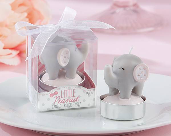 Original vela con forma de elefante gris con orejitas y peana en color rosa.