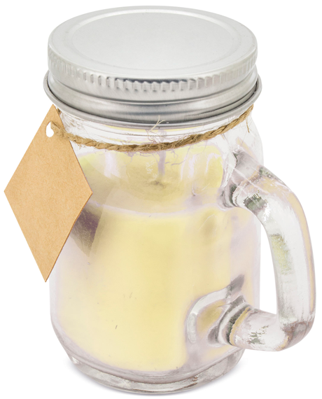 Original vela aromática inspiradas en la naturaleza, presentada en una simpática jarrita de cristal con asas y tapa metálica.